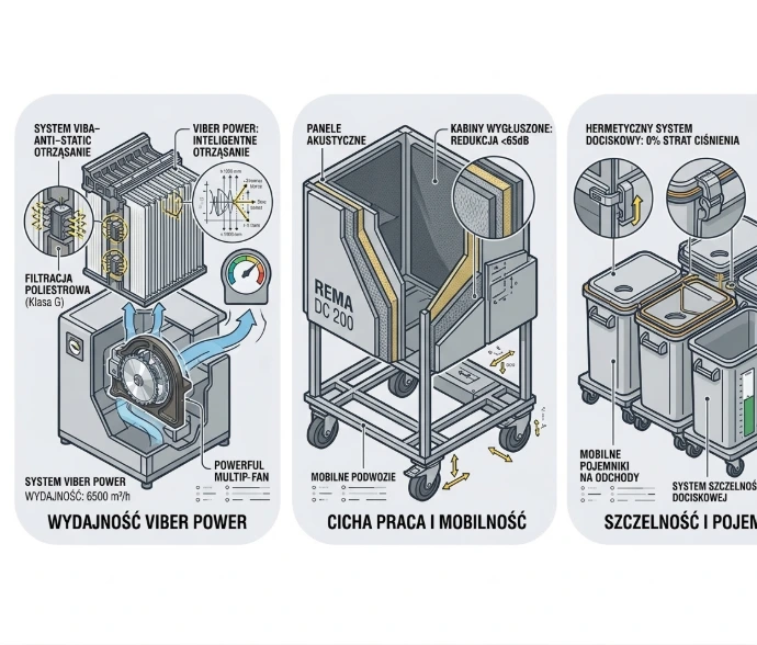REMA DC 200 6500 m³/h to niezawodny wyciąg przemysłowy, który dzięki masywnej, hartowanej konstrukcji oraz zaawansowanej filtracji poliestrowej klasy „G” zapewnia skuteczne usuwanie zanieczyszczeń z kilku maszyn jednocześnie. To idealny wybór dla profesjonalistów poszukujących bezawaryjnego systemu odpylania, który łączy wysoką energooszczędność z precyzyjnym monitorowaniem stanu filtrów.