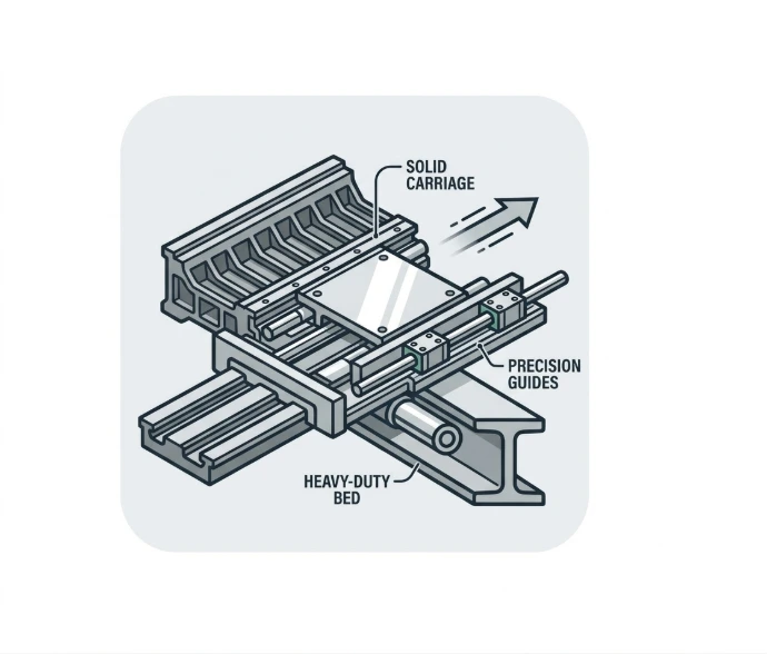 Wózek o długości 3500 mm prowadzony jest na stalowych prętach, co zapewnia płynność posuwu i stabilność nawet przy obróbce pełnowymiarowych arkuszy płyt.
