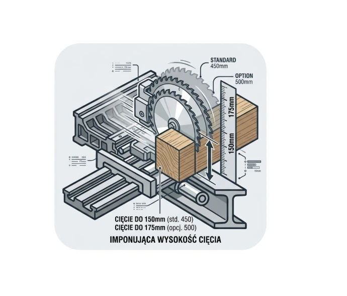 Dzięki możliwości zamontowania tarczy o średnicy do 450 mm (standard) lub nawet 500 mm (opcja), maszyna pozwala na cięcie elementów o grubości do 150-175 mm.