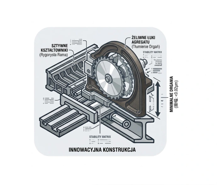 Korpus maszyny oparty na sztywnych kształtownikach oraz żeliwne łuki agregatu tnącego gwarantują stabilność pracy i minimalizację drgań.